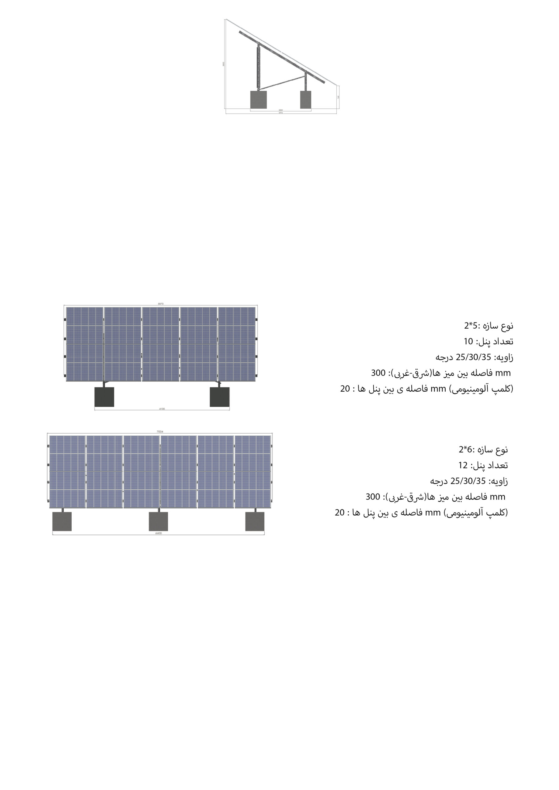 - نوع سیستم : سازه ثابت دو ردیفه ( زمینی، پشت بامی، نیروگاهی و کشاورزی)